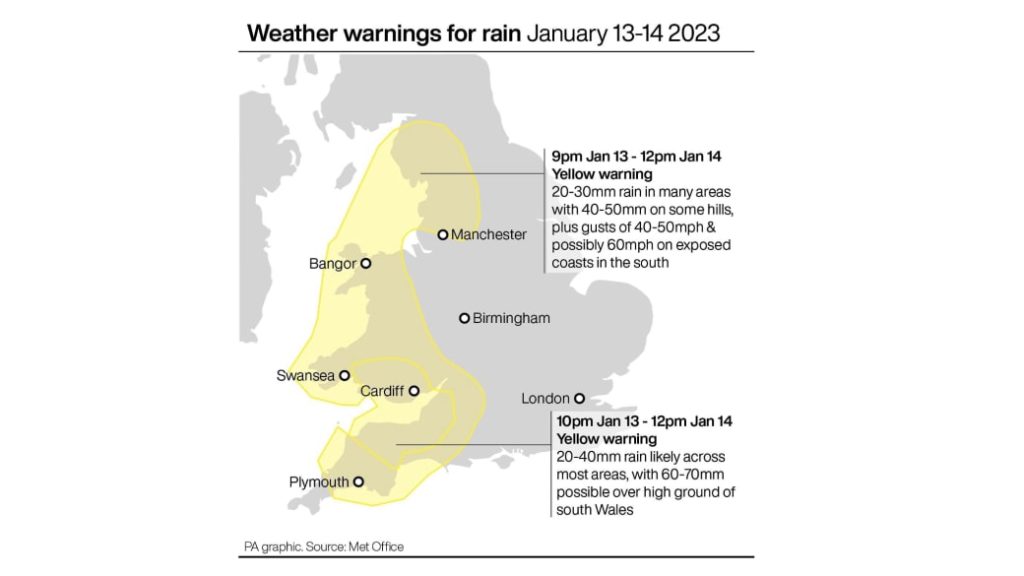 A yellow weather warning has been issued by the Met Office for rain in Wales and many parts of England, which will be in place from Friday night until midday on Saturday.