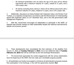 “These developments have necessitated the final extension of the deadline from January 31, 2023, to Tuesday, February 7, 2023, and a new settlement date of Tuesday, February 14, 2023, that will be confirmed via the new Exchange Memorandum,” the Finance Ministry added.