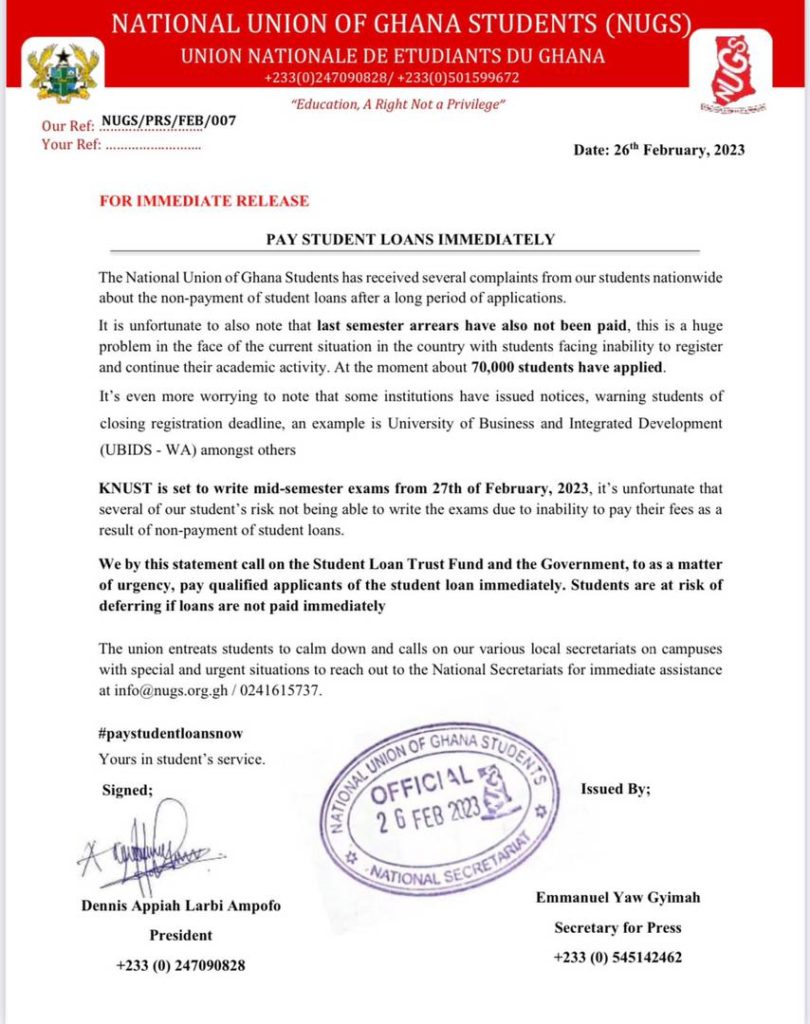 “The National Union of Ghana Students has received several complaints from our students nationwide about the non-payment of student loans after a long period of applications.