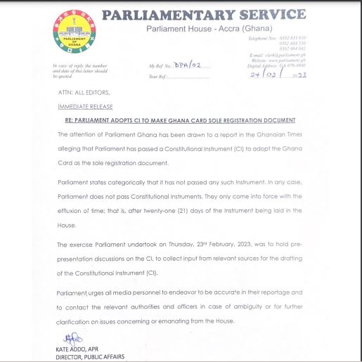Parliament has refuted claims that it has passed the Electoral Commission (EC’s) Constitutional Instrument (CI) that seeks to make the Ghana Card the sole document for voter registration.