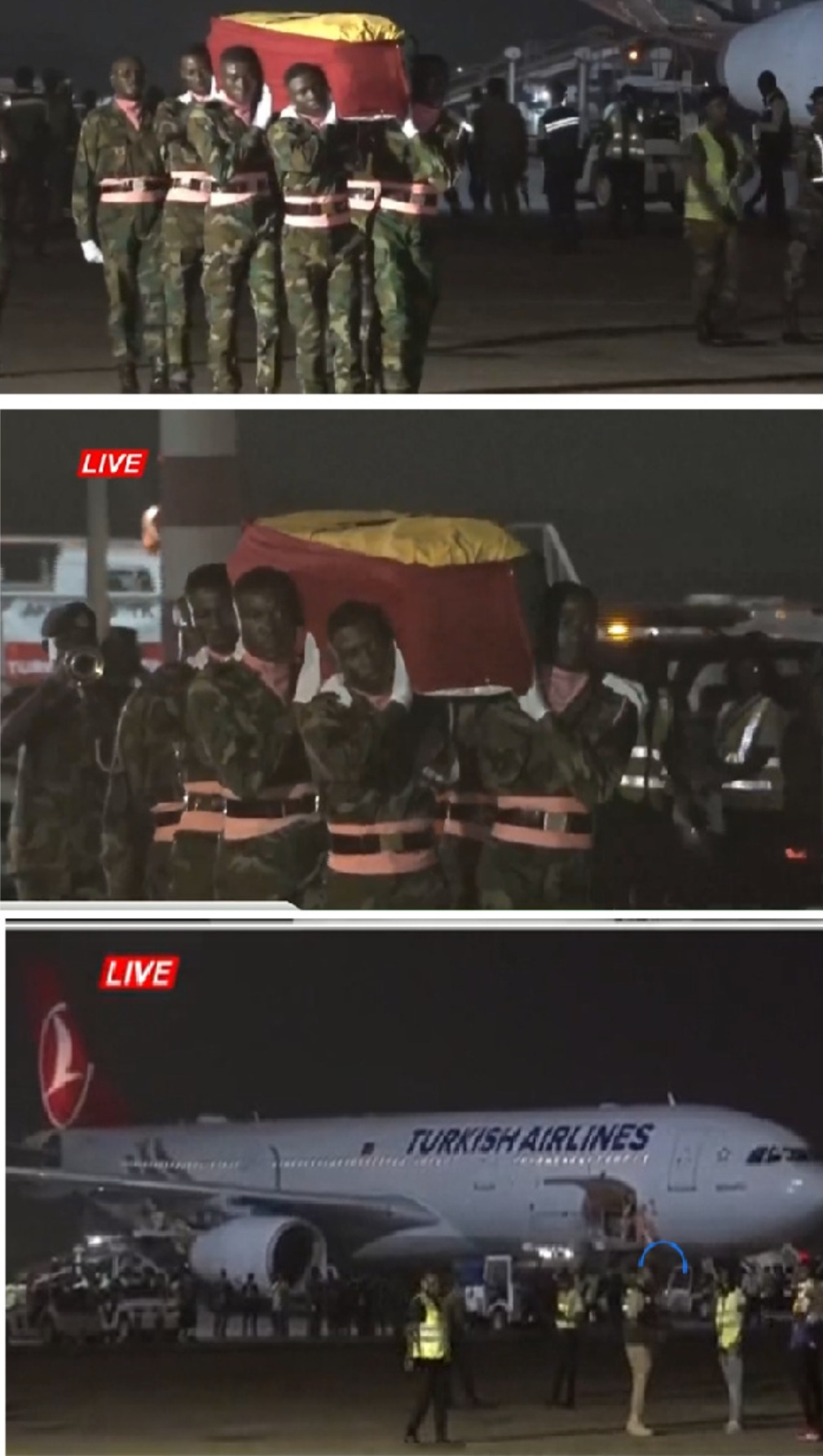 The first sight of Atsu’s coffin showed six soldiers carrying the remains draped in the national colours of red, gold, green with the Black Star.