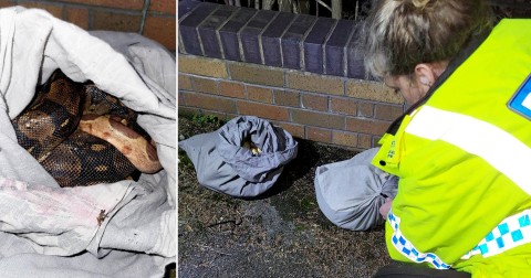 At first she thought they were two bags of sand left over from road works, but closer inspection revealed the cases contained four large snakes.
