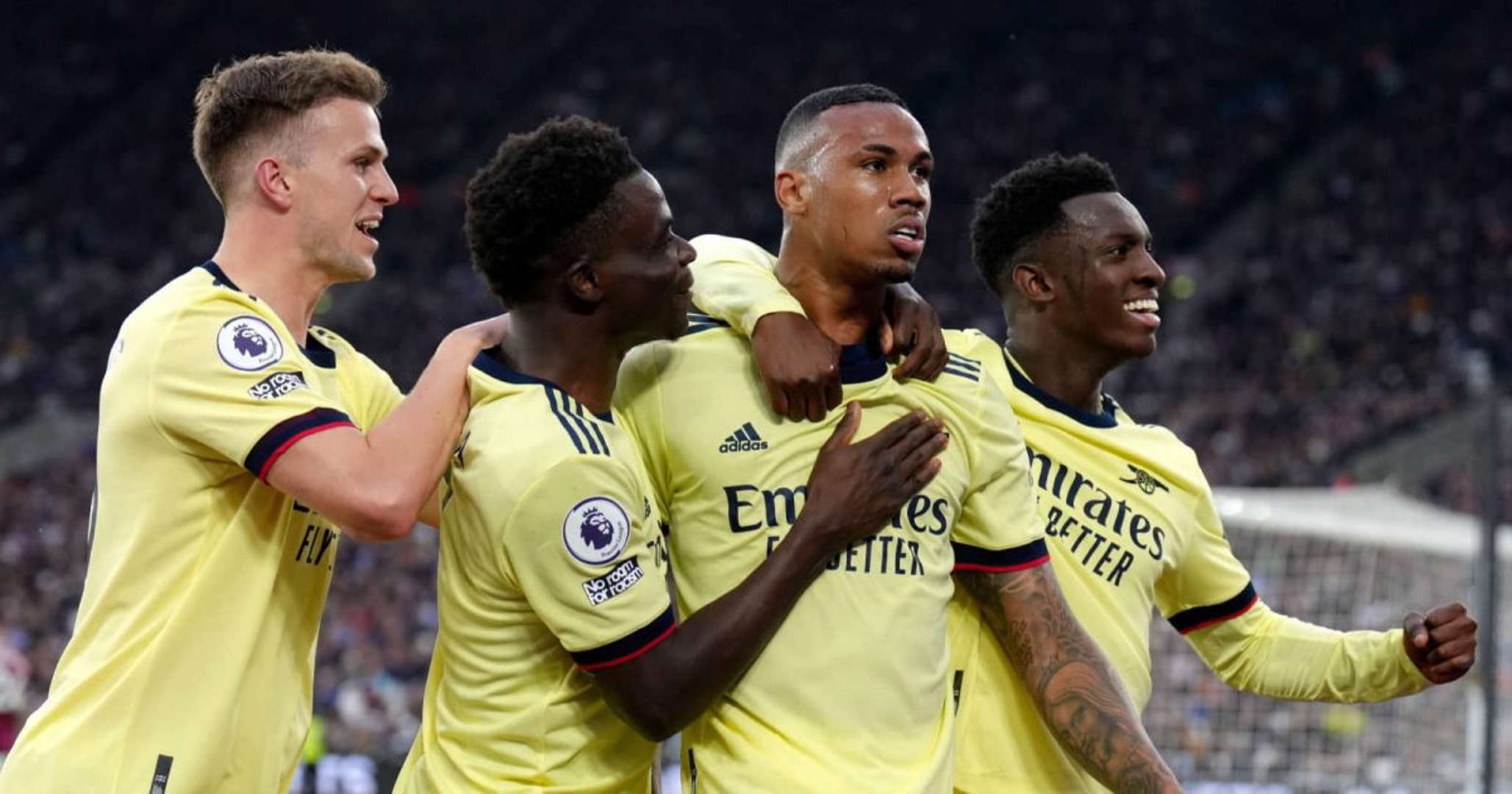 Gabriel Magalhaes celebrates scoring Arsenal goal with Bukayo Saka, Eddie Nketiah and Rob Holding© PA Images