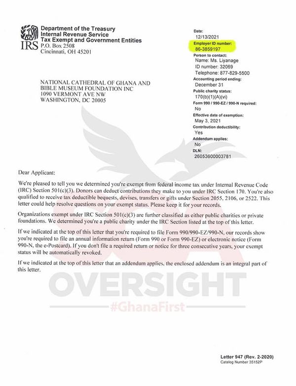 “By an intercepted IRS tax exempt letter dated December 13, 2021 — I can confirm that the Employer ID Number for the National Cathedral of Ghana and Bible Museum Foundation, Inc is: 86-3859197. (See letter attached).