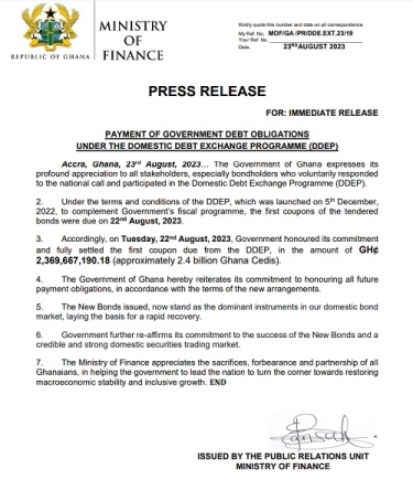 In a press release issued on Wednesday, the Ministry of Finance said: “Under the terms and conditions of the DDEP, which was launched on December 5, 2022, to complement Government’s fiscal programme, the first coupons of the tendered bonds were due on August 22nd, 2023. Accordingly, on Tuesday, August 22nd, 2023, government honoured its commitment and fully settled the first coupon due from the DDEP, in the amount of approximately GH¢2.4 billion.”