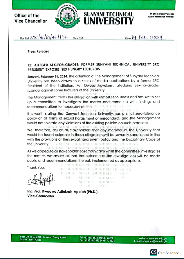 In a statement dated February 14, 2024, the Vice-Chancellor of STU, Prof Kwadwo Adinkra-Appiah said the management treats the allegations with utmost seriousness.