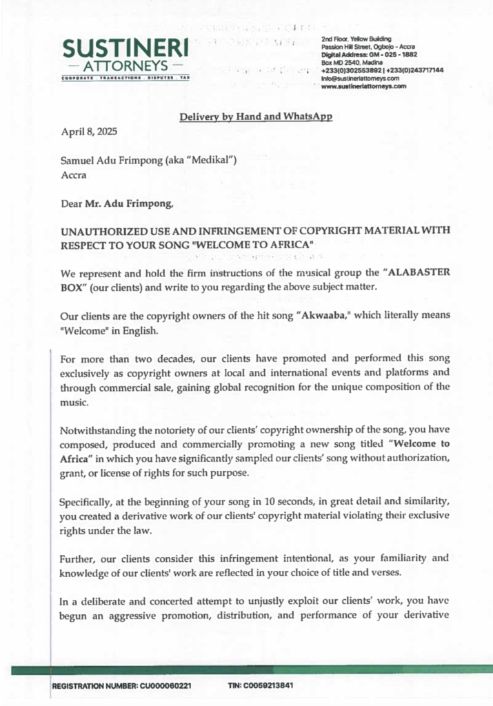 In a formal letter, the legal team asserts that the first 10 seconds of Welcome to Africa directly reproduce elements from Akwaaba.