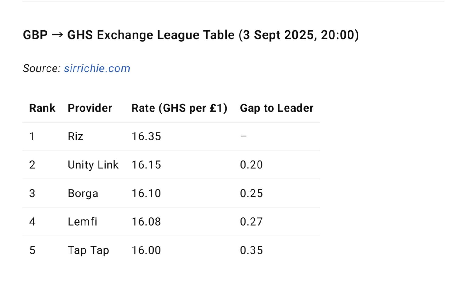 In practical terms, the depreciation means that Ghanaians now need more cedis to buy the same pound compared to earlier months. For example, a remittance of £100 through the highest-paying provider (Riz) now fetches GHS 1,635, while the same amount through Tap Tap delivers GHS 1,600—a 35 cedi difference.