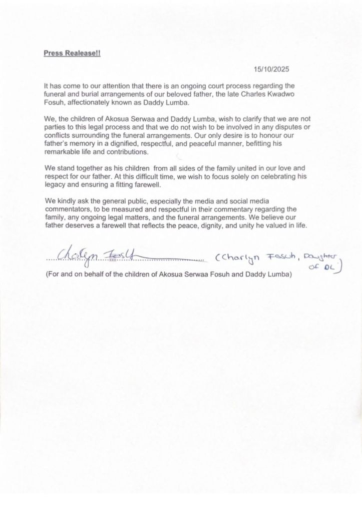 “We, the children of Akosua Serwaa and Daddy Lumba, wish to clarify that we are not parties to this legal process and that we do not wish to be involved in any disputes or conflicts surrounding the funeral arrangements,” it further indicates.