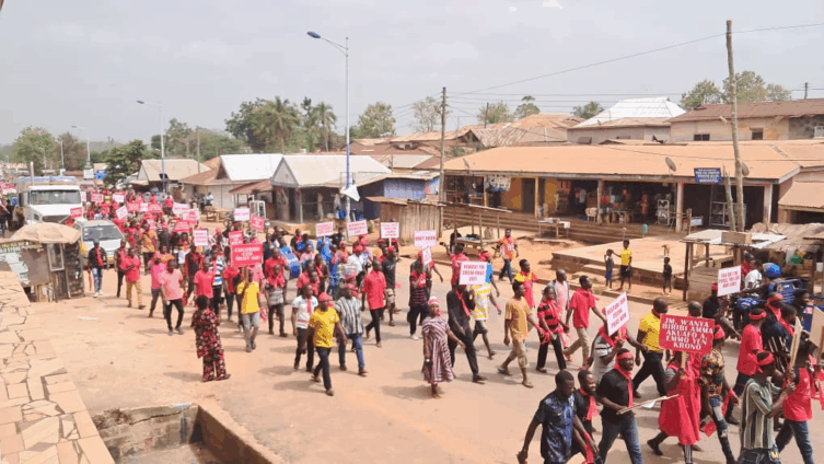 Farmers from districts such as Sefwi Wiawso, Juaboso and Bia West marched through principal streets, waving placards reading “Restore Our Price Now” and “Cocoa Sustains Ghana, Don’t Neglect Farmers.”